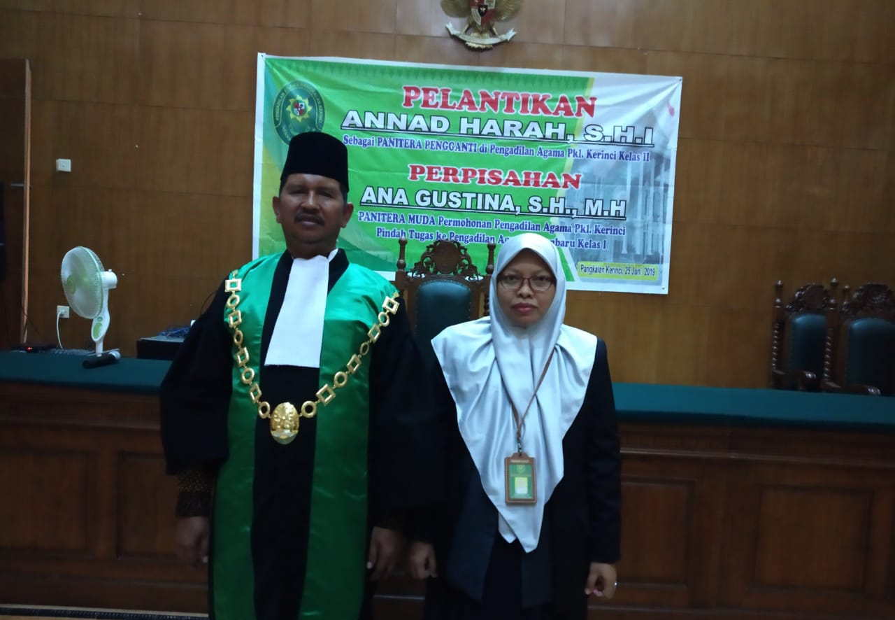 Selasa, 25 Juni 2019, bertempat di Aula Pengadilan Agama Pangkalan Kerinci, dilangsungkan acara Pengambilan Sumpah Jabatan dan Pelantikan Panitera Pengganti Sdri. Annad Harah, S.H.I. yang sebelumnya adalah Jurusita Pengganti Pengadilan Agama Pangkalan Kerinci, Berdasarkan Keputusan Direktur Jenderal Badan Peradilan Agama Mahkamah Agung RI Nomor 2327 Tahun 2019 tanggal 27 mei 2019 diangkat dalam jabatan Panitera Pengganti pada Pengadilan Agama Pangkalan Kerinci. Acara dipimpin oleh Ketua Pengadilan Agama Pangkalan Kerinci Bapak Baginda, S.Ag.,M.H. dan dihadiri oleh para hakim, pejabat struktural/fungsional dan seluruh karyawan/karyawati Pengadilan Agama Pangkalan Kerinci.